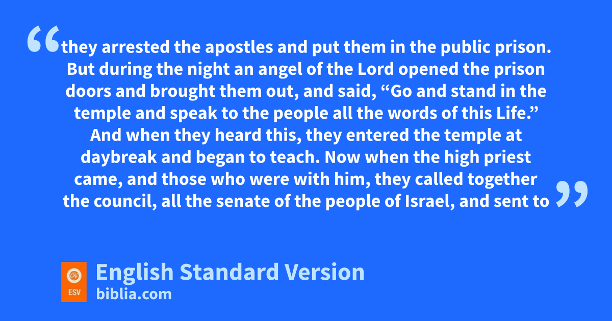 17 But the high priest rose up, and all who were with him (that is, the party of qthe Sadducees), and filled with rjealousy 18 they arrested the apostles and sput them in the public prison. 19 But during the night tan angel of the Lord uopened the prison doors and brought them out, and said, 20 “Go and stand in the temple and speak to the people all vthe words of wthis xLife.” 21 And when they heard this, ythey entered the temple zat daybreak and began to teach.