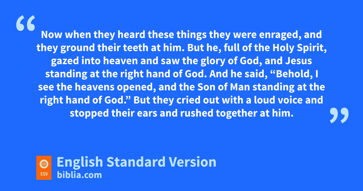54 Now when they heard these things lthey were enraged, and they mground their teeth at him. 55 But he, nfull of the Holy Spirit, gazed into heaven and saw othe glory of God, and Jesus standing pat the right hand of God. 56 And he said, “Behold, I see qthe heavens opened, and rthe Son of Man standing pat the right hand of God.” 57 But they cried out with a loud voice and stopped their ears and rushed together2 at him. 58 Then sthey cast him out of the city and tstoned him. And uthe witnesses laid down their garments vat the feet of a young man named Saul. 59 And as they were stoning Stephen, whe called out, “Lord Jesus, xreceive my spirit.” 60 And yfalling to his knees he cried out with a loud voice, z“Lord, do not hold this sin against them.” And when he had said this, ahe fell asleep.