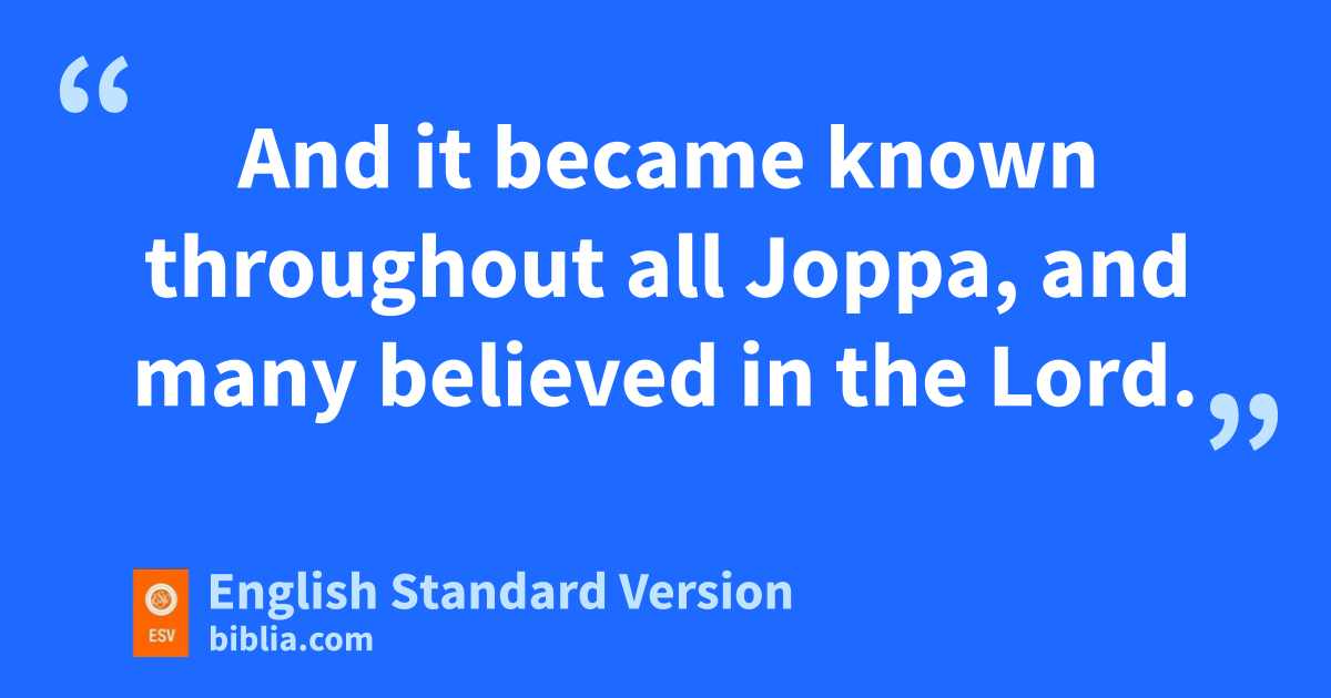 36 Now there was in mJoppa a disciple named Tabitha, which, translated, means Dorcas.4 She was full of ngood works and acts of charity. 37 In those days she became ill and died, and when they had washed her, they laid her in oan upper room. 38 Since Lydda was near Joppa, the disciples, hearing that Peter was there, sent two men to him, urging him, p“Please come to us without delay.” 39 So Peter rose and went with them. And when he arrived, they took him to qthe upper room. All the widows stood beside him weeping and showing tunics5 and other garments that Dorcas made while she was with them. 40 But Peter rput them all outside, and sknelt down and prayed; and turning to the body the said, “Tabitha, arise.” And she opened her eyes, and when she saw Peter she sat up. 41 And he gave her his hand and raised her up. Then, calling the saints and widows, he presented her alive. 42 And it became known throughout all Joppa, and umany believed in the Lord. 43 And he stayed in Joppa for many days vwith one Simon, a tanner.