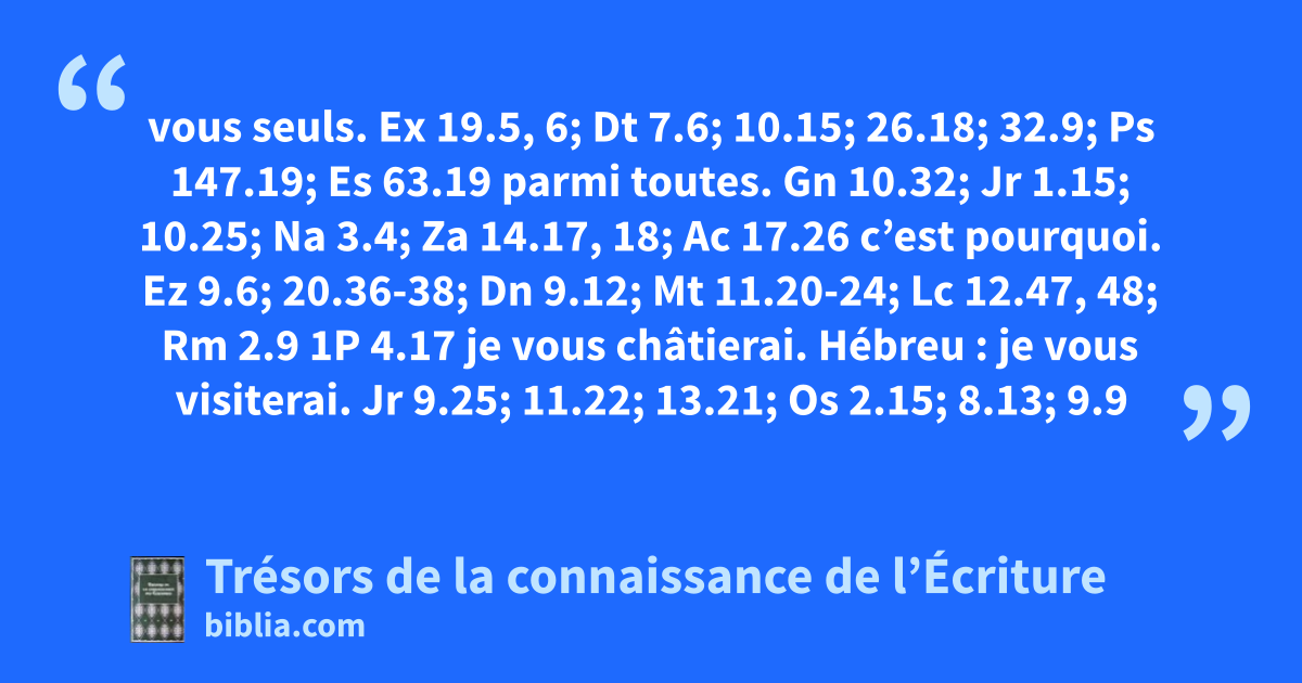 vous seuls. Ex 19.5, 6; Dt 7.6; 10.15; 26.18; 32.9; Ps 147.19; Es 63.19 parmi toutes. Gn 10.32; Jr 1.15; 10.25; Na 3.4; Za 14.17, 18; Ac 17.26 c’est pourquoi. Ez 9.6; 20.36-38; Dn 9.12; Mt 11.20-24; Lc 12.47, 48; Rm 2.9 1P 4.17 je vous châtierai. Hébreu : je vous visiterai. Jr 9.25; 11.22; 13.21; Os 2.15; 8.13; 9.9