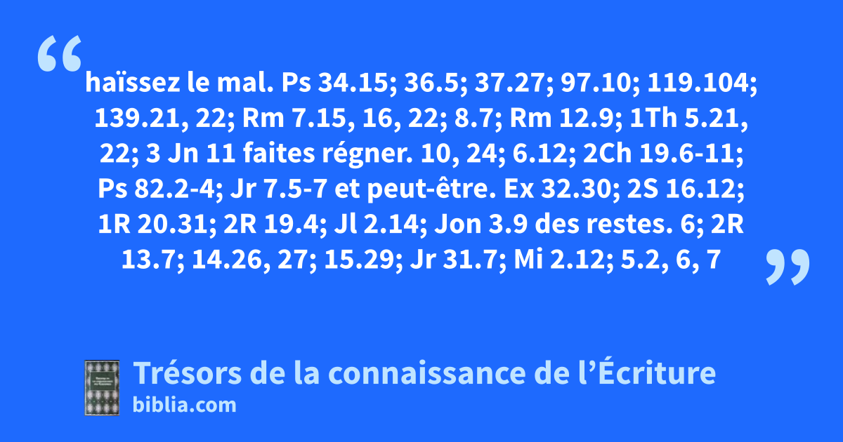 haïssez le mal. Ps 34.15; 36.5; 37.27; 97.10; 119.104; 139.21, 22; Rm 7.15, 16, 22; 8.7; Rm 12.9; 1Th 5.21, 22; 3 Jn 11 faites régner. 10, 24; 6.12; 2Ch 19.6-11; Ps 82.2-4; Jr 7.5-7 et peut-être. Ex 32.30; 2S 16.12; 1R 20.31; 2R 19.4; Jl 2.14; Jon 3.9 des restes. 6; 2R 13.7; 14.26, 27; 15.29; Jr 31.7; Mi 2.12; 5.2, 6, 7