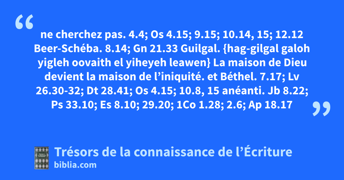 ne cherchez pas. 4.4; Os 4.15; 9.15; 10.14, 15; 12.12 Beer-Schéba. 8.14; Gn 21.33 Guilgal. {hag-gilgal galoh yigleh oovaith el yiheyeh leawen} La maison de Dieu devient la maison de l’iniquité. et Béthel. 7.17; Lv 26.30-32; Dt 28.41; Os 4.15; 10.8, 15 anéanti. Jb 8.22; Ps 33.10; Es 8.10; 29.20; 1Co 1.28; 2.6; Ap 18.17