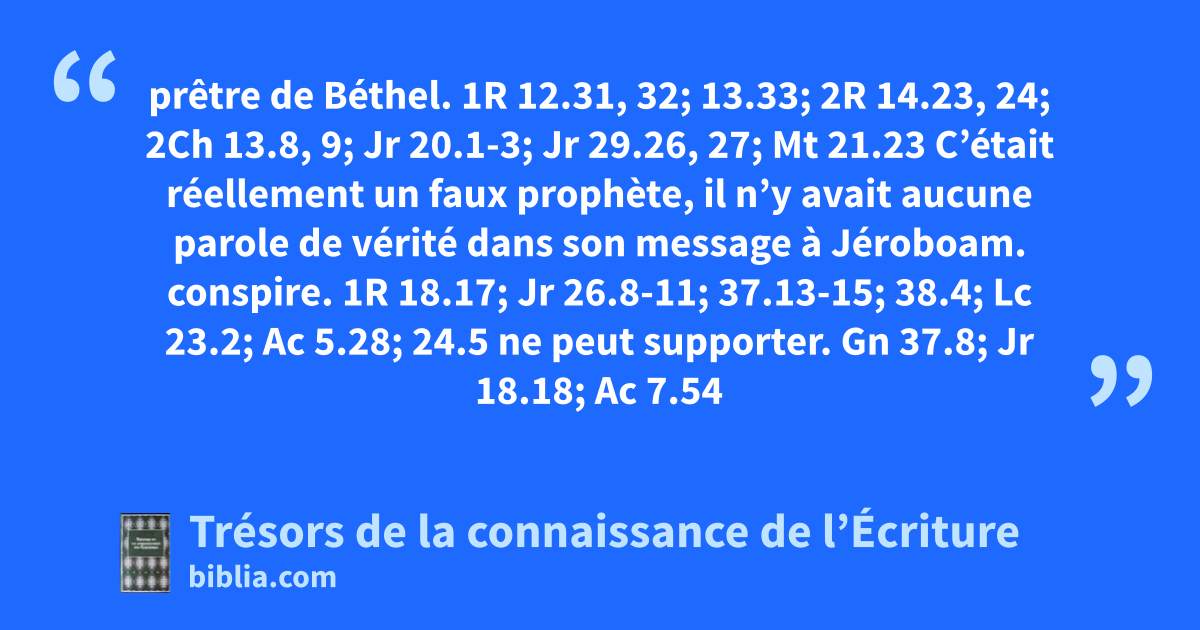 prêtre de Béthel. 1R 12.31, 32; 13.33; 2R 14.23, 24; 2Ch 13.8, 9; Jr 20.1-3; Jr 29.26, 27; Mt 21.23 C’était réellement un faux prophète, il n’y avait aucune parole de vérité dans son message à Jéroboam. conspire. 1R 18.17; Jr 26.8-11; 37.13-15; 38.4; Lc 23.2; Ac 5.28; 24.5 ne peut supporter. Gn 37.8; Jr 18.18; Ac 7.54