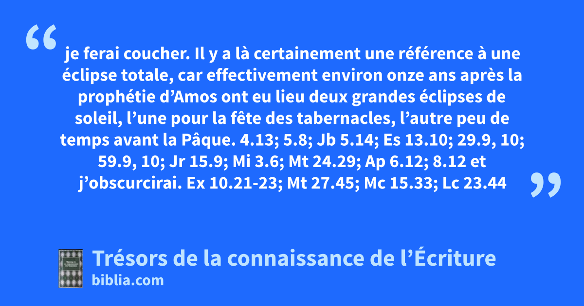 je ferai coucher. Il y a là certainement une référence à une éclipse totale, car effectivement environ onze ans après la prophétie d’Amos ont eu lieu deux grandes éclipses de soleil, l’une pour la fête des tabernacles, l’autre peu de temps avant la Pâque. 4.13; 5.8; Jb 5.14; Es 13.10; 29.9, 10; 59.9, 10; Jr 15.9; Mi 3.6; Mt 24.29; Ap 6.12; 8.12 et j’obscurcirai. Ex 10.21-23; Mt 27.45; Mc 15.33; Lc 23.44