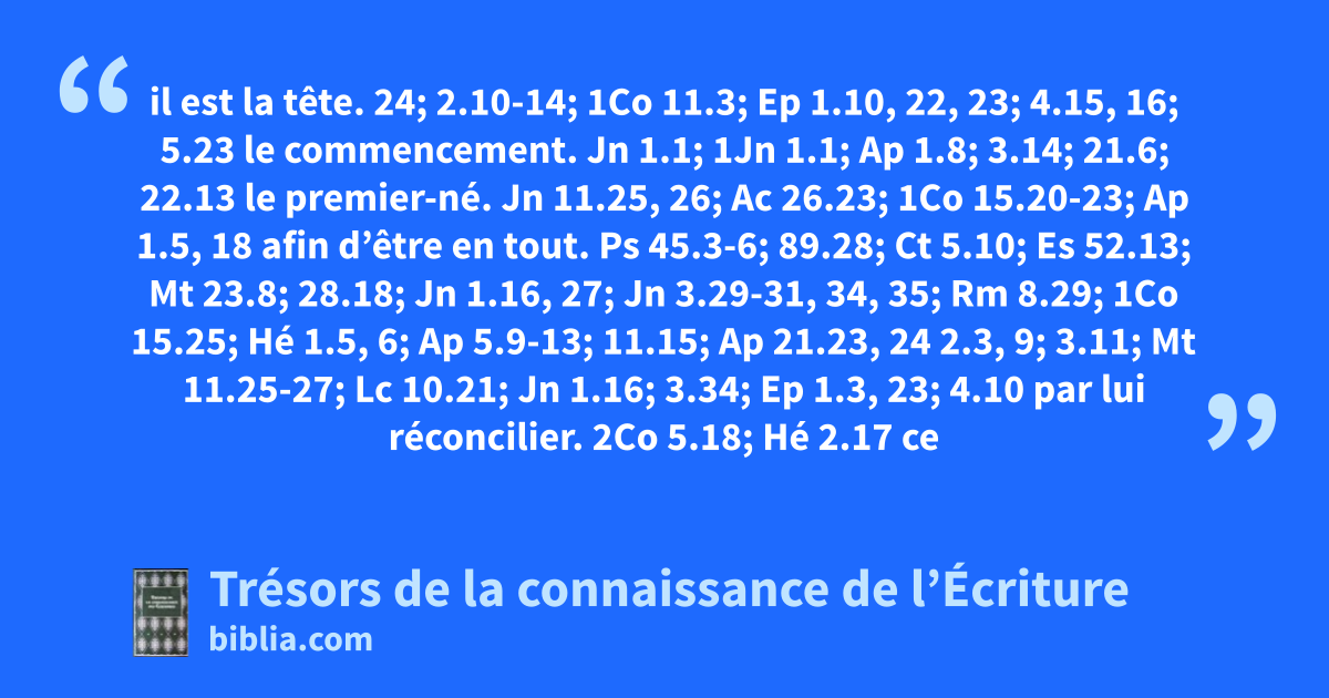 il est la tête. 24; 2.10-14; 1Co 11.3; Ep 1.10, 22, 23; 4.15, 16; 5.23 le commencement. Jn 1.1; 1Jn 1.1; Ap 1.8; 3.14; 21.6; 22.13 le premier-né. Jn 11.25, 26; Ac 26.23; 1Co 15.20-23; Ap 1.5, 18 afin d’être en tout. Ps 45.3-6; 89.28; Ct 5.10; Es 52.13; Mt 23.8; 28.18; Jn 1.16, 27; Jn 3.29-31, 34, 35; Rm 8.29; 1Co 15.25; Hé 1.5, 6; Ap 5.9-13; 11.15; Ap 21.23, 24