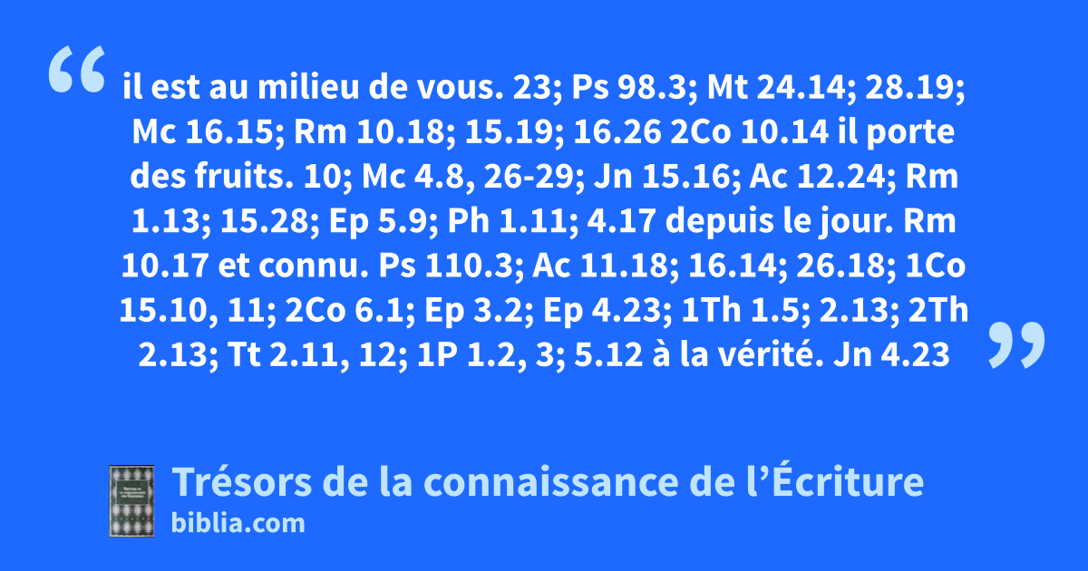 il est au milieu de vous. 23; Ps 98.3; Mt 24.14; 28.19; Mc 16.15; Rm 10.18; 15.19; 16.26 2Co 10.14 il porte des fruits. 10; Mc 4.8, 26-29; Jn 15.16; Ac 12.24; Rm 1.13; 15.28; Ep 5.9; Ph 1.11; 4.17 depuis le jour. Rm 10.17 et connu. Ps 110.3; Ac 11.18; 16.14; 26.18; 1Co 15.10, 11; 2Co 6.1; Ep 3.2; Ep 4.23; 1Th 1.5; 2.13; 2Th 2.13; Tt 2.11, 12; 1P 1.2, 3; 5.12 à la vérité. Jn 4.23
