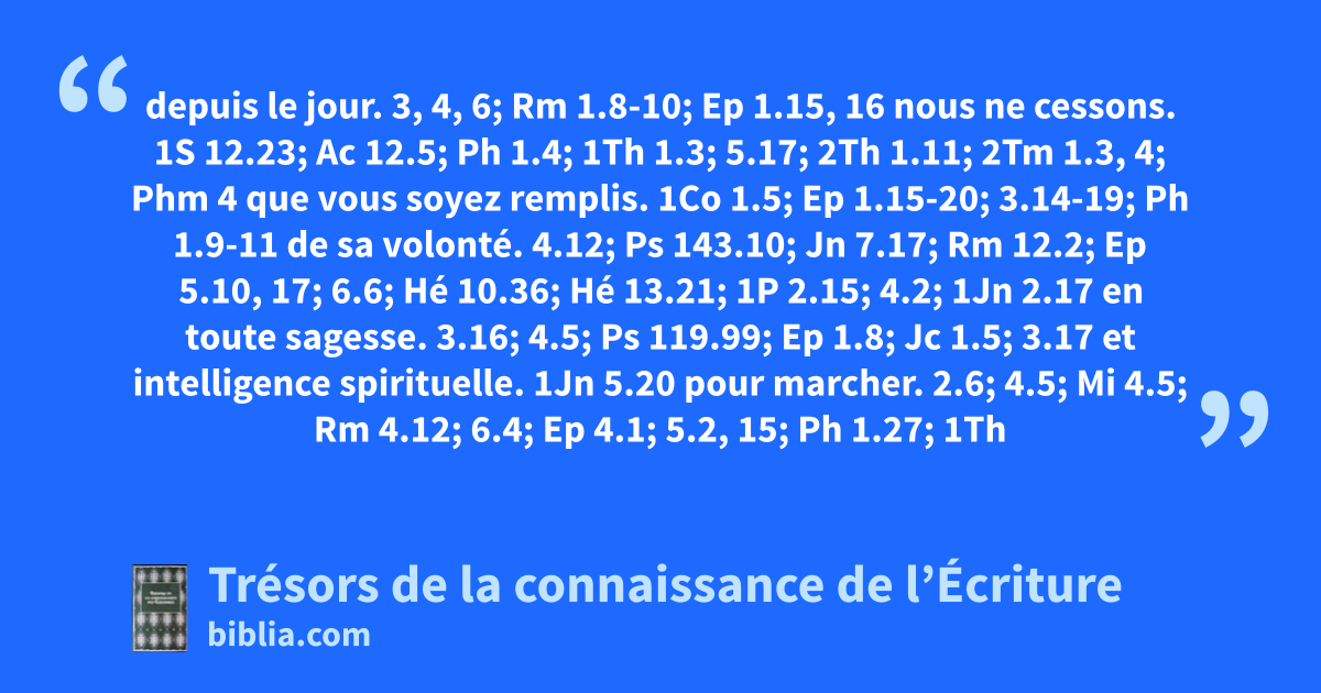 depuis le jour. 3, 4, 6; Rm 1.8-10; Ep 1.15, 16 nous ne cessons. 1S 12.23; Ac 12.5; Ph 1.4; 1Th 1.3; 5.17; 2Th 1.11; 2Tm 1.3, 4; Phm 4 que vous soyez remplis. 1Co 1.5; Ep 1.15-20; 3.14-19; Ph 1.9-11 de sa volonté. 4.12; Ps 143.10; Jn 7.17; Rm 12.2; Ep 5.10, 17; 6.6; Hé 10.36; Hé 13.21; 1P 2.15; 4.2; 1Jn 2.17 en toute sagesse. 3.16; 4.5; Ps 119.99; Ep 1.8; Jc 1.5; 3.17 et intelligence spirituelle. 1Jn 5.20