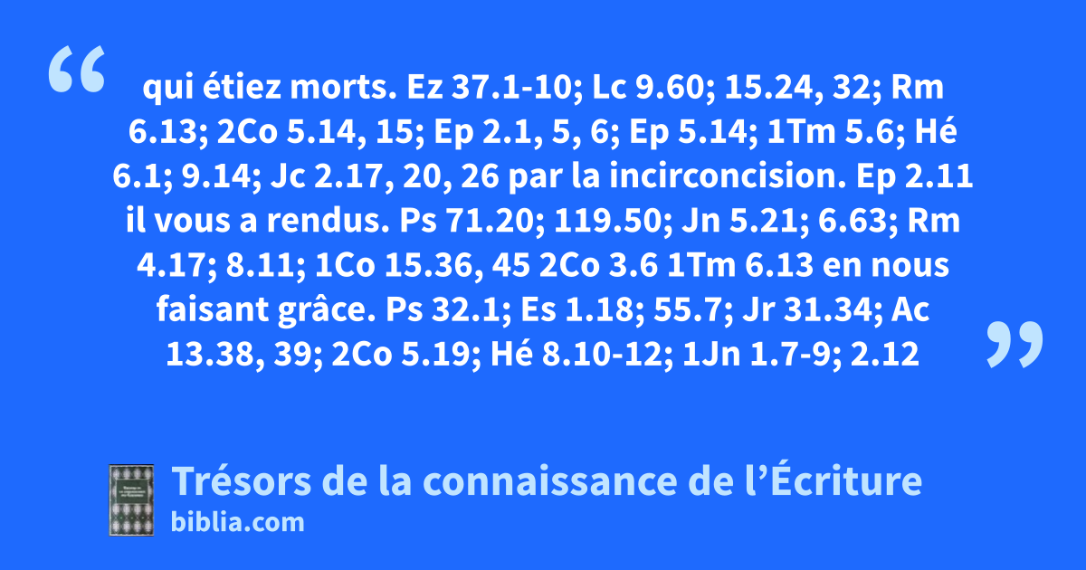qui étiez morts. Ez 37.1-10; Lc 9.60; 15.24, 32; Rm 6.13; 2Co 5.14, 15; Ep 2.1, 5, 6; Ep 5.14; 1Tm 5.6; Hé 6.1; 9.14; Jc 2.17, 20, 26 par la incirconcision. Ep 2.11 il vous a rendus. Ps 71.20; 119.50; Jn 5.21; 6.63; Rm 4.17; 8.11; 1Co 15.36, 45 2Co 3.6 1Tm 6.13 en nous faisant grâce. Ps 32.1; Es 1.18; 55.7; Jr 31.34; Ac 13.38, 39; 2Co 5.19; Hé 8.10-12; 1Jn 1.7-9; 2.12