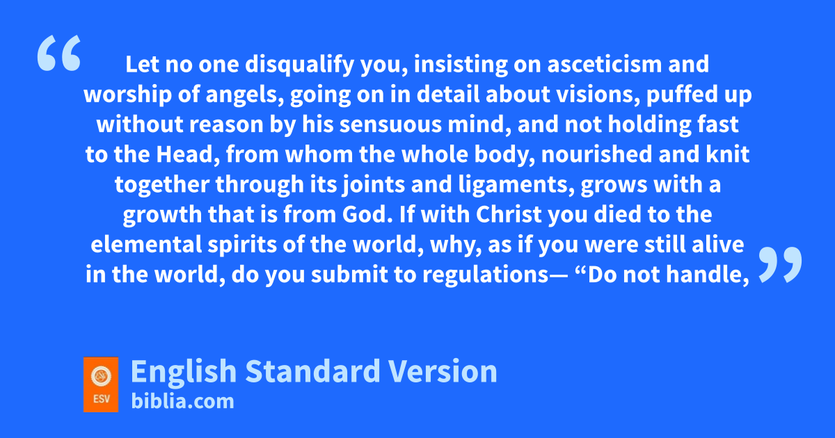 16 Therefore let no one gpass judgment on you hin questions of food and drink, or with regard to ia festival or ja new moon or a Sabbath. 17 kThese are a shadow of the things to come, but lthe substance belongs to Christ. 18 Let no one mdisqualify you, ninsisting on asceticism and worship of angels, ogoing on in detail about visions,4 ppuffed up without reason by qhis sensuous mind, 19 and rnot sholding fast to the Head, from whom the whole body, nourished and knit together through its joints and ligaments, grows with a growth that is from God.