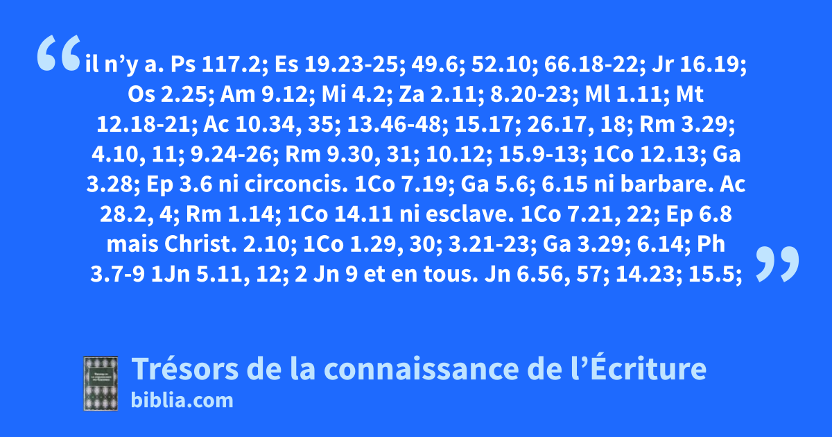 il n’y a. Ps 117.2; Es 19.23-25; 49.6; 52.10; 66.18-22; Jr 16.19; Os 2.25; Am 9.12; Mi 4.2; Za 2.11; 8.20-23; Ml 1.11; Mt 12.18-21; Ac 10.34, 35; 13.46-48; 15.17; 26.17, 18; Rm 3.29; 4.10, 11; 9.24-26; Rm 9.30, 31; 10.12; 15.9-13; 1Co 12.13; Ga 3.28; Ep 3.6 ni circoncis. 1Co 7.19; Ga 5.6; 6.15 ni barbare. Ac 28.2, 4; Rm 1.14; 1Co 14.11 ni esclave. 1Co 7.21, 22; Ep 6.8 mais Christ. 2.10; 1Co 1.29, 30; 3.21-23; Ga 3.29; 6.14; Ph 3.7-9 1Jn 5.11, 12; 2 Jn 9 et en tous. Jn 6.56, 57; 14.23; 15.5; 17.23; Rm 8.10, 11; Ga 2.20; Ep 1.23; 3.17 1Jn 5.20