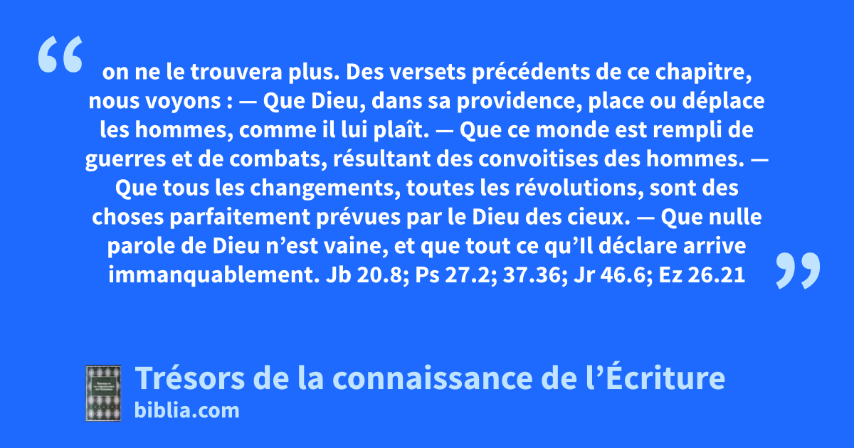 on ne le trouvera plus. Des versets précédents de ce chapitre, nous voyons : — Que Dieu, dans sa providence, place ou déplace les hommes, comme il lui plaît. — Que ce monde est rempli de guerres et de combats, résultant des convoitises des hommes. — Que tous les changements, toutes les révolutions, sont des choses parfaitement prévues par le Dieu des cieux. — Que nulle parole de Dieu n’est vaine, et que tout ce qu’Il déclare arrive immanquablement. Jb 20.8; Ps 27.2; 37.36; Jr 46.6; Ez 26.21