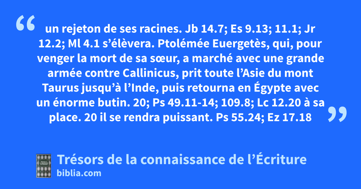 un rejeton de ses racines. Jb 14.7; Es 9.13; 11.1; Jr 12.2; Ml 4.1 s’élèvera. Ptolémée Euergetès, qui, pour venger la mort de sa sœur, a marché avec une grande armée contre Callinicus, prit toute l’Asie du mont Taurus jusqu’à l’Inde, puis retourna en Égypte avec un énorme butin. 20; Ps 49.11-14; 109.8; Lc 12.20 à sa place. 20 il se rendra puissant. Ps 55.24; Ez 17.18