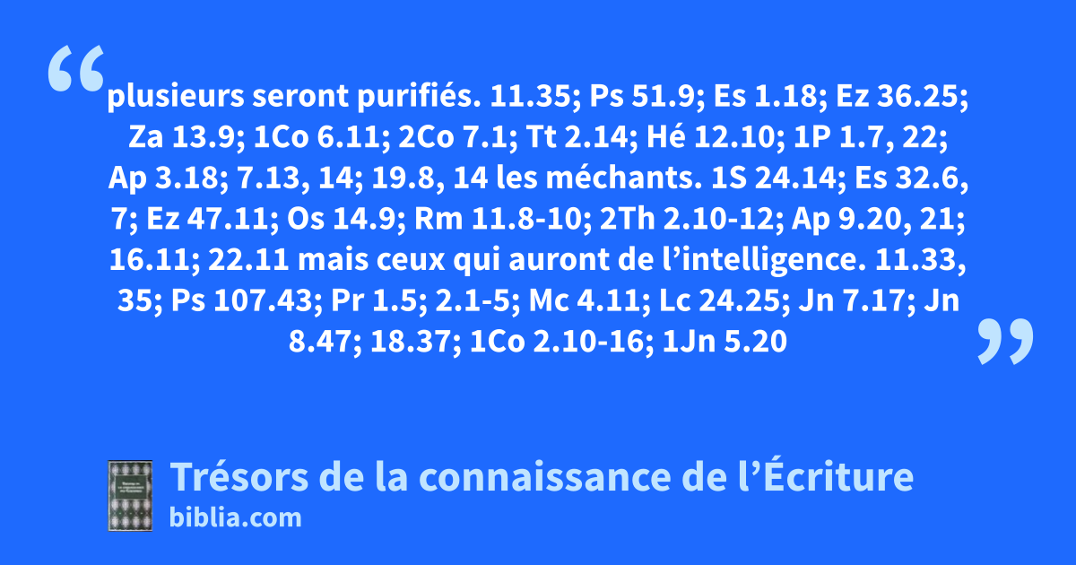 plusieurs seront purifiés. 11.35; Ps 51.9; Es 1.18; Ez 36.25; Za 13.9; 1Co 6.11; 2Co 7.1; Tt 2.14; Hé 12.10; 1P 1.7, 22; Ap 3.18; 7.13, 14; 19.8, 14 les méchants. 1S 24.14; Es 32.6, 7; Ez 47.11; Os 14.9; Rm 11.8-10; 2Th 2.10-12; Ap 9.20, 21; 16.11; 22.11 mais ceux qui auront de l’intelligence. 11.33, 35; Ps 107.43; Pr 1.5; 2.1-5; Mc 4.11; Lc 24.25; Jn 7.17; Jn 8.47; 18.37; 1Co 2.10-16; 1Jn 5.20