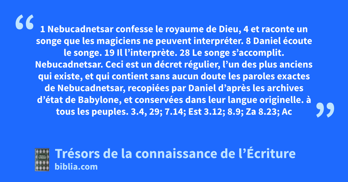 Nebucadnetsar. Ceci est un décret régulier, l’un des plus anciens qui existe, et qui contient sans aucun doute les paroles exactes de Nebucadnetsar, recopiées par Daniel d’après les archives d’état de Babylone, et conservées dans leur langue originelle. à tous les peuples. 3.4, 29; 7.14; Est 3.12; 8.9; Za 8.23; Ac 2.6 que la paix. 6.25, 27; 1Ch 12.18; Esd 4.17; 5.7; Rm 1.7; Ep 1.2; 1Tm 1.2; 1P 1.2