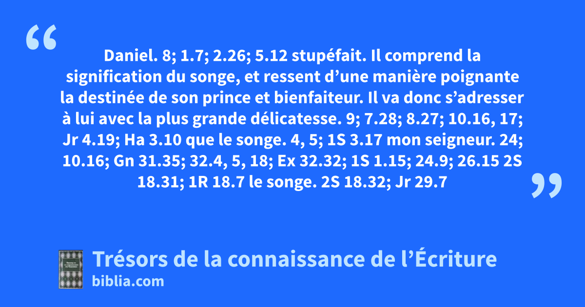 Daniel. 8; 1.7; 2.26; 5.12 stupéfait. Il comprend la signification du songe, et ressent d’une manière poignante la destinée de son prince et bienfaiteur. Il va donc s’adresser à lui avec la plus grande délicatesse. 9; 7.28; 8.27; 10.16, 17; Jr 4.19; Ha 3.10 que le songe. 4, 5; 1S 3.17 mon seigneur. 24; 10.16; Gn 31.35; 32.4, 5, 18; Ex 32.32; 1S 1.15; 24.9; 26.15 2S 18.31; 1R 18.7 le songe. 2S 18.32; Jr 29.7