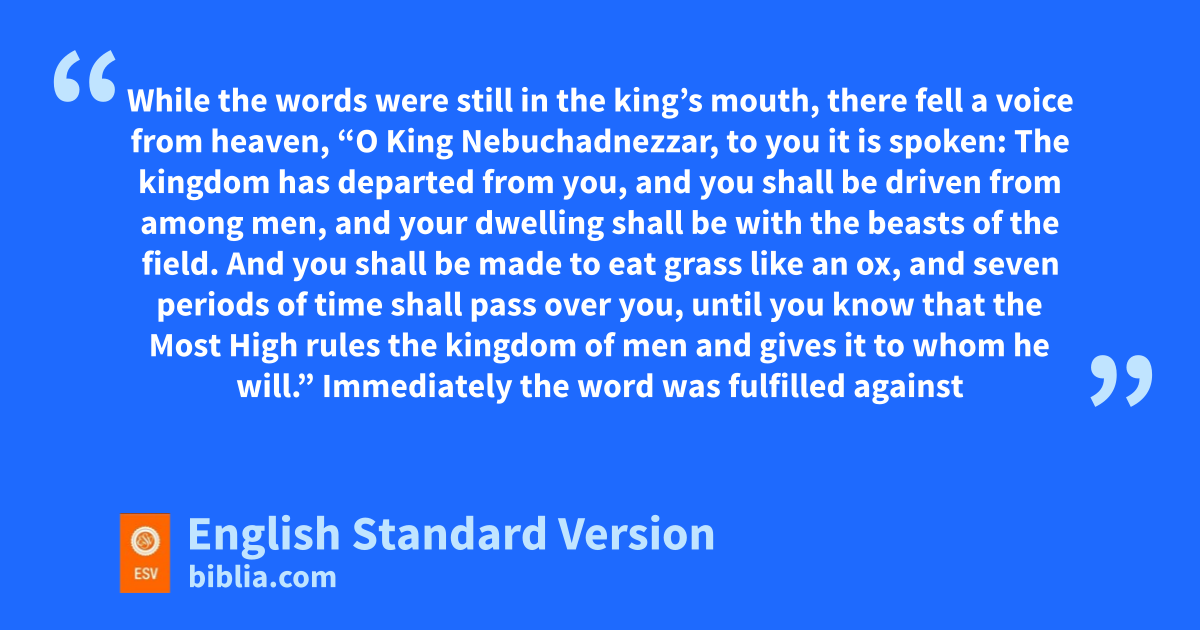 28 All this came upon King Nebuchadnezzar. 29 At the end of twelve months he was walking on the roof of the royal palace of Babylon, 30 and the king answered and said, j“Is not this great Babylon, which I have built by kmy mighty power as a royal residence and for kthe glory of my majesty?” 31 lWhile the words were still in the king’s mouth, there fell a voice from heaven, “O King Nebuchadnezzar, to you it is spoken: The kingdom has departed from you, 32 mand you shall be driven from among men, and your dwelling shall be with the beasts of the field. And you shall be made to eat grass like an ox, and seven periods of time shall pass over you, muntil you know that the Most High rules the kingdom of men and gives it to whom he will.” 33 Immediately the word was fulfilled against Nebuchadnezzar. mHe was driven from among men and ate grass like an ox, and his body was wet with the dew of heaven till his hair grew as long as eagles’ feathers, and his nails were like birds’ claws.
