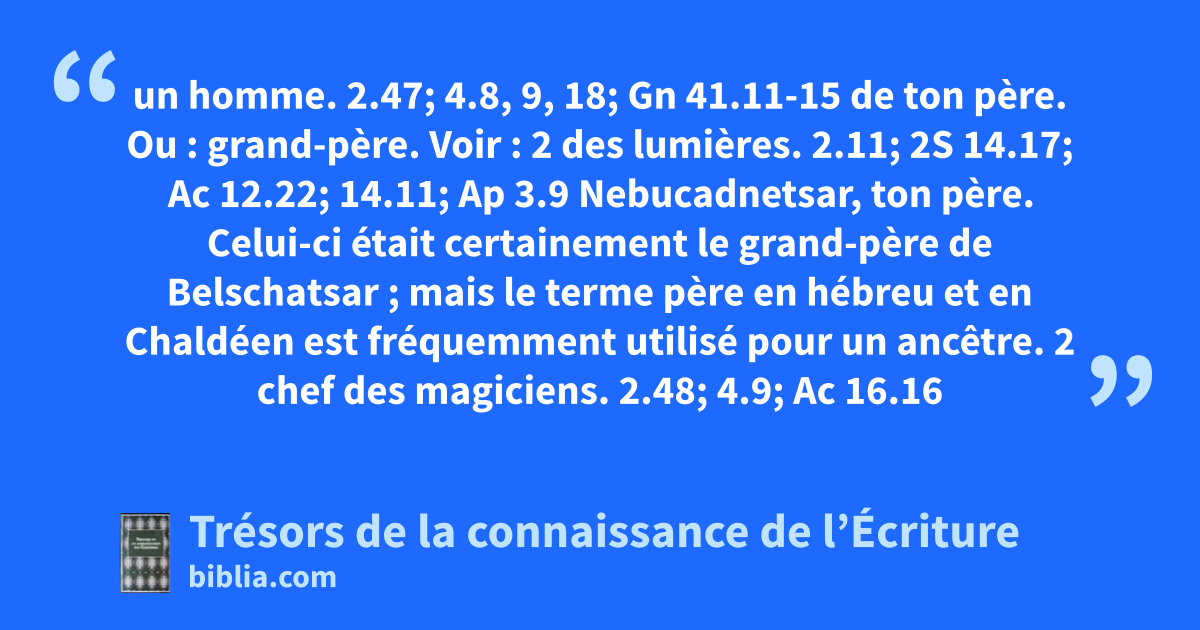 un homme. 2.47; 4.8, 9, 18; Gn 41.11-15 de ton père. Ou : grand-père. Voir : 2 des lumières. 2.11; 2S 14.17; Ac 12.22; 14.11; Ap 3.9 Nebucadnetsar, ton père. Celui-ci était certainement le grand-père de Belschatsar ; mais le terme père en hébreu et en Chaldéen est fréquemment utilisé pour un ancêtre. 2 chef des magiciens. 2.48; 4.9; Ac 16.16