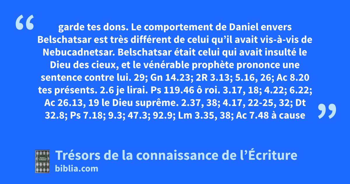 garde tes dons. Le comportement de Daniel envers Belschatsar est très différent de celui qu’il avait vis-à-vis de Nebucadnetsar. Belschatsar était celui qui avait insulté le Dieu des cieux, et le vénérable prophète prononce une sentence contre lui. 29; Gn 14.23; 2R 3.13; 5.16, 26; Ac 8.20 tes présents. 2.6 je lirai. Ps 119.46