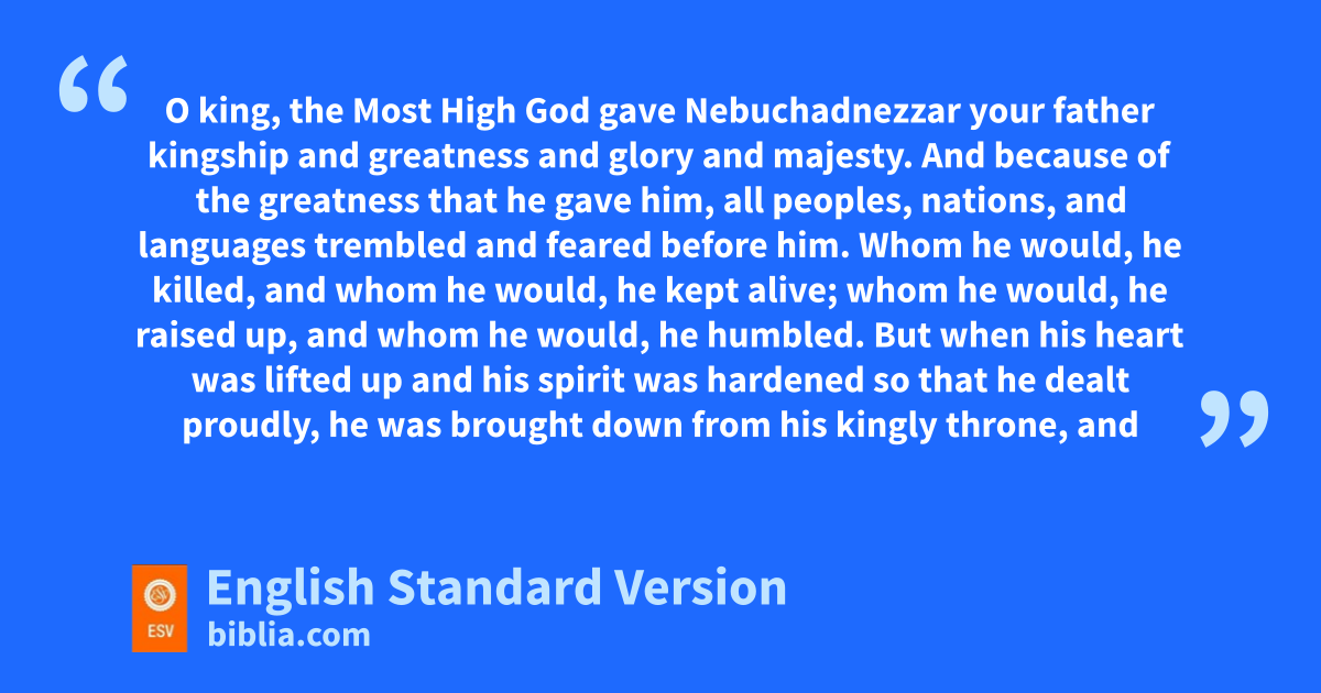 17 Then Daniel answered and said before the king, q“Let your gifts be for yourself, and give your rewards to another. Nevertheless, I will read the writing to the king and make known to him the interpretation. 18 O king, the rMost High God sgave tNebuchadnezzar your father ukingship and greatness and glory and majesty. 19 And because of the greatness that he gave him, vall peoples, nations, and languages wtrembled and feared before him. Whom he would, he killed, and whom he would, he kept alive; whom he would, he raised up, and whom he would, he humbled. 20 But xwhen his heart was lifted up and his spirit was hardened so that he dealt proudly, yhe was brought down from his kingly throne, and his glory was taken from him. 21 zHe was driven from among the children of mankind, and his mind was made like that of a beast, and his dwelling was with the wild donkeys. He was fed grass like an ox, and his body was wet with the dew of heaven, zuntil he knew that the rMost High God rules the kingdom of mankind and sets over it whom he will. 22 And you his son,6 aBelshazzar, bhave not humbled your heart, though you knew all this, 23 but you have lifted up yourself against cthe Lord of heaven. And dthe vessels of his house have been brought in before you, and you and your lords, your wives, and your concubines have drunk wine from them. eAnd you have praised the gods of silver and gold, of bronze, iron, wood, and stone, which do not see or hear or know, fbut the God in whose hand is your breath, and gwhose are all your ways, hyou have not honored.