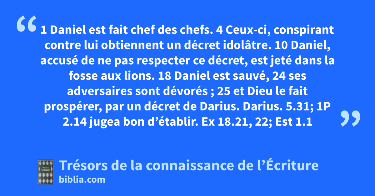 1 Daniel est fait chef des chefs. 4 Ceux-ci, conspirant contre lui obtiennent un décret idolâtre. 10 Daniel, accusé de ne pas respecter ce décret, est jeté dans la fosse aux lions. 18 Daniel est sauvé, 24 ses adversaires sont dévorés ; 25 et Dieu le fait prospérer, par un décret de Darius.