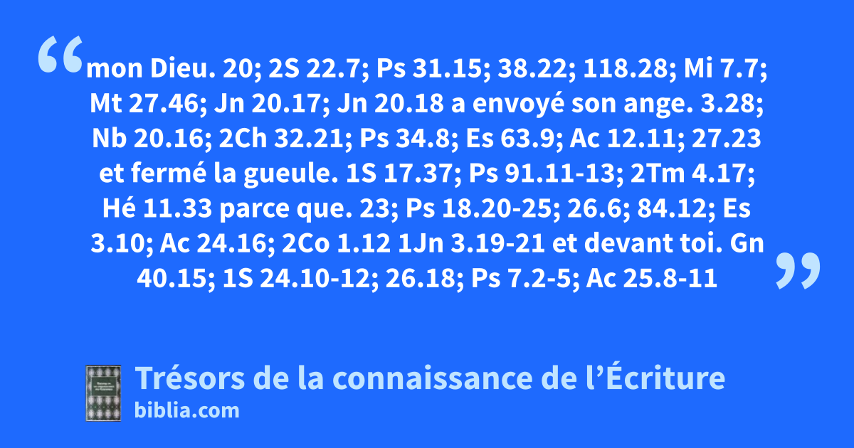 mon Dieu. 20; 2S 22.7; Ps 31.15; 38.22; 118.28; Mi 7.7; Mt 27.46; Jn 20.17; Jn 20.18 a envoyé son ange. 3.28; Nb 20.16; 2Ch 32.21; Ps 34.8; Es 63.9; Ac 12.11; 27.23 et fermé la gueule. 1S 17.37; Ps 91.11-13; 2Tm 4.17; Hé 11.33 parce que. 23; Ps 18.20-25; 26.6; 84.12; Es 3.10; Ac 24.16; 2Co 1.12 1Jn 3.19-21 et devant toi. Gn 40.15; 1S 24.10-12; 26.18; Ps 7.2-5; Ac 25.8-11