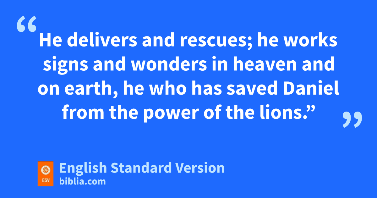 19 Then, at break of day, the king arose and went in haste to the den of lions. 20 As he came near to the den where Daniel was, he cried out in a tone of anguish. The king declared to Daniel, “O Daniel, servant of vthe living God, ohas your God, whom you serve continually, wbeen able to deliver you from the lions?” 21 Then Daniel said to the king, x“O king, live forever! 22 My God ysent his angel zand shut the lions’ mouths, and they have not harmed me, because I was found blameless abefore him; aand also before you, O king, I have done no harm.” 23 Then the king was exceedingly glad, and commanded that Daniel be taken up out of the den. So Daniel was taken up out of the den, and bno kind of harm was found on him, because he had trusted in his God. 24 And the king commanded, and cthose men who had maliciously accused Daniel were brought and cast into the den of lions—they, their children, and their wives. And before they reached the bottom of the den, the lions overpowered them and broke all their bones in pieces.