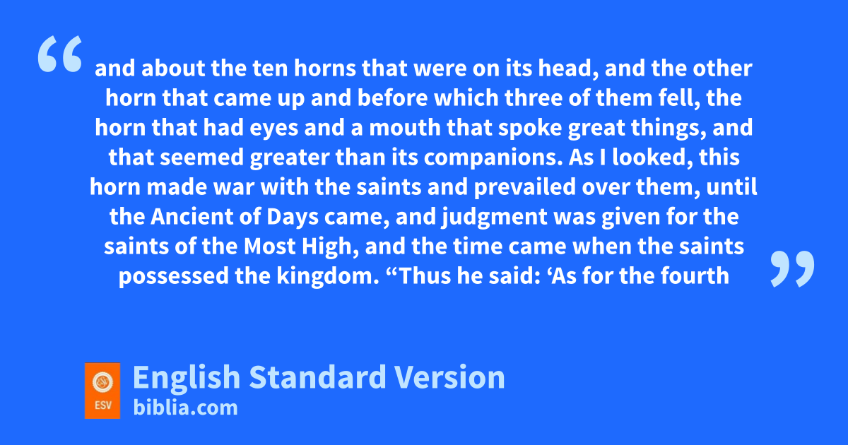 19 “Then I desired to know the truth about vthe fourth beast, which was different from all the rest, exceedingly terrifying, with its teeth of iron and claws of bronze, and which devoured and broke in pieces and stamped what was left with its feet, 20 wand about the ten horns that were on its head, and the other horn that came up and before which three of them fell, the horn that had eyes and a mouth that spoke great things, and that seemed greater than its companions. 21 As I looked, this horn xmade war with the saints and prevailed over them, 22 until the yAncient of Days came, and ujudgment was given for the saints of the Most High, and the time came when uthe saints possessed the kingdom.