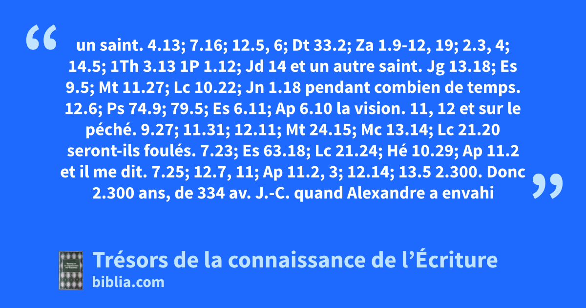 un saint. 4.13; 7.16; 12.5, 6; Dt 33.2; Za 1.9-12, 19; 2.3, 4; 14.5; 1Th 3.13 1P 1.12; Jd 14 et un autre saint. Jg 13.18; Es 9.5; Mt 11.27; Lc 10.22; Jn 1.18 pendant combien de temps. 12.6; Ps 74.9; 79.5; Es 6.11; Ap 6.10 la vision. 11, 12 et sur le péché. 9.27; 11.31; 12.11; Mt 24.15; Mc 13.14; Lc 21.20 seront-ils foulés. 7.23; Es 63.18; Lc 21.24; Hé 10.29; Ap 11.2