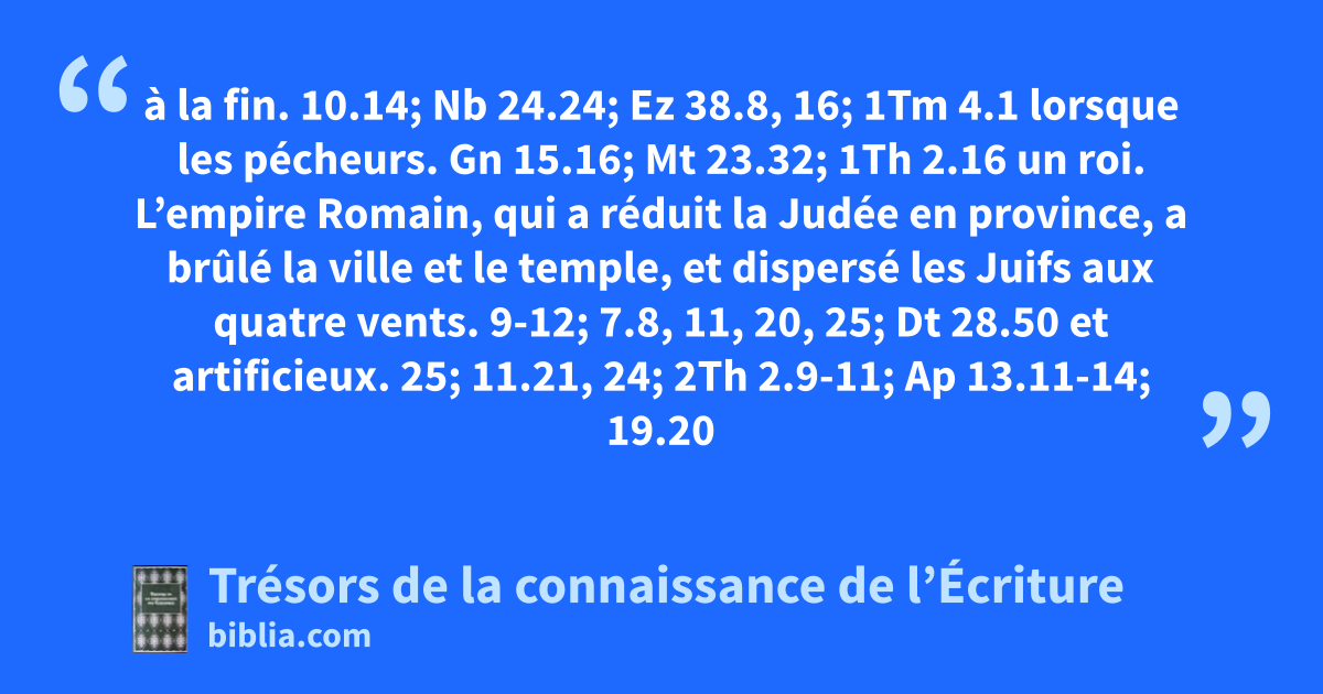 à la fin. 10.14; Nb 24.24; Ez 38.8, 16; 1Tm 4.1 lorsque les pécheurs. Gn 15.16; Mt 23.32; 1Th 2.16 un roi. L’empire Romain, qui a réduit la Judée en province, a brûlé la ville et le temple, et dispersé les Juifs aux quatre vents. 9-12; 7.8, 11, 20, 25; Dt 28.50 et artificieux. 25; 11.21, 24; 2Th 2.9-11; Ap 13.11-14; 19.20