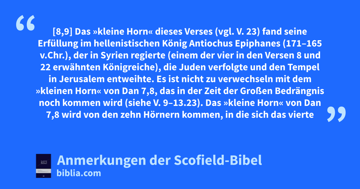 (2) Daniel sieht aber ein »kleines Horn« aufkommen, das sich drei von den zehn Königen unterwirft (V. 24–26). Sein besonderes Kennzeichen ist Hass gegen Gott und seine Gläubigen. Es ist nicht zu verwechseln mit dem »kleinen Horn« von Kapitel 8, einer Prophetie, die in Antiochus Epiphanes bereits geschichtlich erfüllt ist (siehe 8,9, Fußnote). In Offb 13 werden noch Besonderheiten des »kleinen Hornes« von Dan 7 hinzugefügt (siehe Offb 13,1, Fußnote).