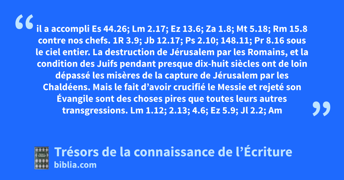 il a accompli Es 44.26; Lm 2.17; Ez 13.6; Za 1.8; Mt 5.18; Rm 15.8 contre nos chefs. 1R 3.9; Jb 12.17; Ps 2.10; 148.11; Pr 8.16 sous le ciel entier. La destruction de Jérusalem par les Romains, et la condition des Juifs pendant presque dix-huit siècles ont de loin dépassé les misères de la capture de Jérusalem par les Chaldéens. Mais le fait d’avoir crucifié le Messie et rejeté son Évangile sont des choses pires que toutes leurs autres transgressions. Lm 1.12; 2.13; 4.6; Ez 5.9; Jl 2.2; Am 3.2; Mt 24.21; Mc 13.19; Lc 21.22
