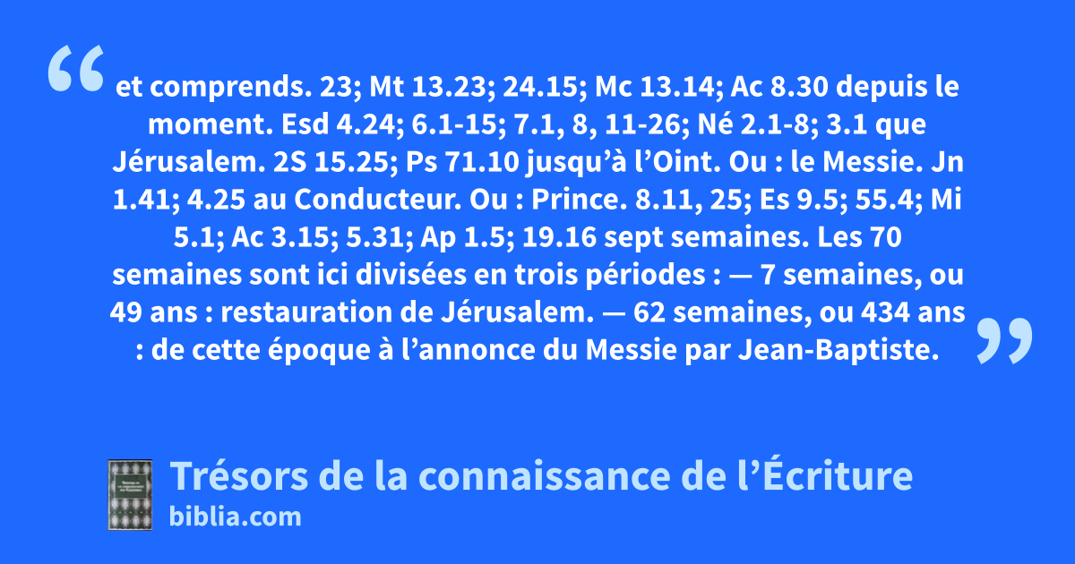 et comprends. 23; Mt 13.23; 24.15; Mc 13.14; Ac 8.30 depuis le moment. Esd 4.24; 6.1-15; 7.1, 8, 11-26; Né 2.1-8; 3.1 que Jérusalem. 2S 15.25; Ps 71.10 jusqu’à l’Oint. Ou : le Messie. Jn 1.41; 4.25 au Conducteur. Ou : Prince. 8.11, 25; Es 9.5; 55.4; Mi 5.1; Ac 3.15; 5.31; Ap 1.5; 19.16 sept semaines. Les 70 semaines sont ici divisées en trois périodes : — 7 semaines, ou 49 ans : restauration de Jérusalem. — 62 semaines, ou 434 ans : de cette époque à l’annonce du Messie par Jean-Baptiste. — 1 semaine, ou 7 ans, pour le ministère de Jean-Baptiste et de Christ lui-même jusqu’à la croix. seront rétablis. Né 4.8, 16-18; Ep 5.16 des temps fâcheux. Né 6.15