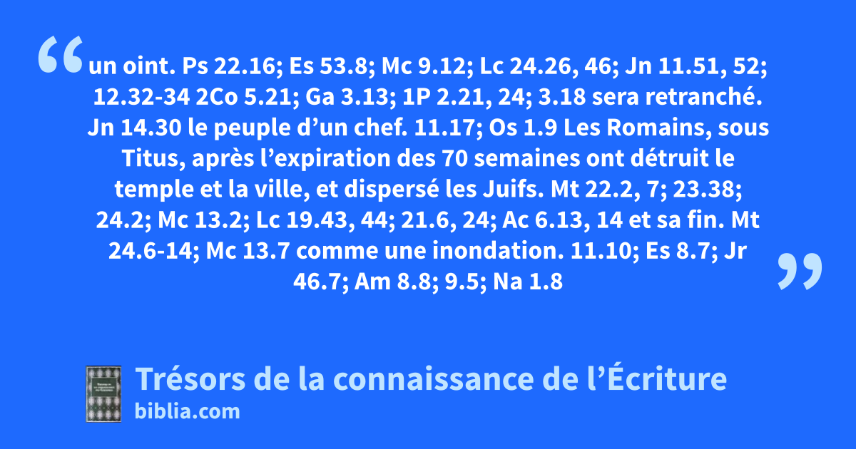 un oint. Ps 22.16; Es 53.8; Mc 9.12; Lc 24.26, 46; Jn 11.51, 52; 12.32-34 2Co 5.21; Ga 3.13; 1P 2.21, 24; 3.18 sera retranché. Jn 14.30 le peuple d’un chef. 11.17; Os 1.9 Les Romains, sous Titus, après l’expiration des 70 semaines ont détruit le temple et la ville, et dispersé les Juifs. Mt 22.2, 7; 23.38; 24.2; Mc 13.2; Lc 19.43, 44; 21.6, 24; Ac 6.13, 14 et sa fin. Mt 24.6-14; Mc 13.7 comme une inondation. 11.10; Es 8.7; Jr 46.7; Am 8.8; 9.5; Na 1.8