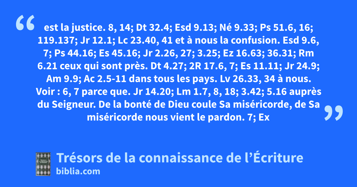 est la justice. 8, 14; Dt 32.4; Esd 9.13; Né 9.33; Ps 51.6, 16; 119.137; Jr 12.1; Lc 23.40, 41 et à nous la confusion. Esd 9.6, 7; Ps 44.16; Es 45.16; Jr 2.26, 27; 3.25; Ez 16.63; 36.31; Rm 6.21 ceux qui sont près. Dt 4.27; 2R 17.6, 7; Es 11.11; Jr 24.9; Am 9.9; Ac 2.5-11 dans tous les pays. Lv 26.33, 34
