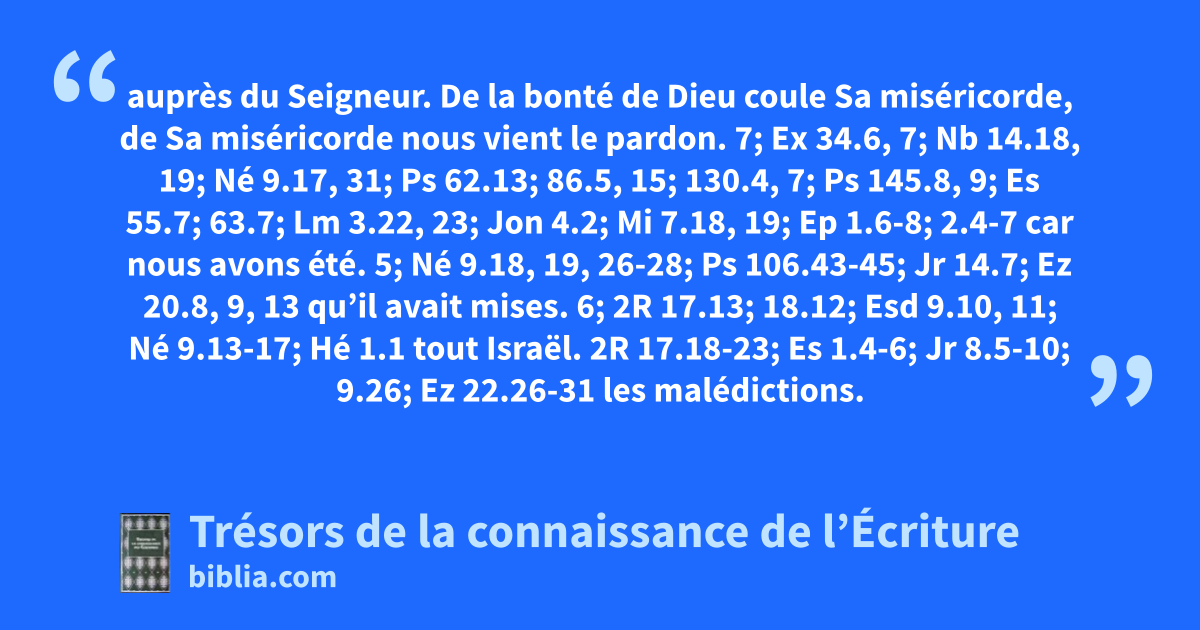 auprès du Seigneur. De la bonté de Dieu coule Sa miséricorde, de Sa miséricorde nous vient le pardon. 7; Ex 34.6, 7; Nb 14.18, 19; Né 9.17, 31; Ps 62.13; 86.5, 15; 130.4, 7; Ps 145.8, 9; Es 55.7; 63.7; Lm 3.22, 23; Jon 4.2; Mi 7.18, 19; Ep 1.6-8; 2.4-7 car nous avons été. 5; Né 9.18, 19, 26-28; Ps 106.43-45; Jr 14.7; Ez 20.8, 9, 13