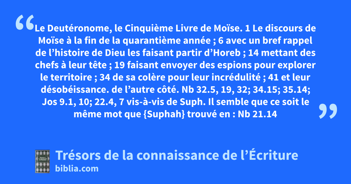 1 Le discours de Moïse à la fin de la quarantième année ; 6 avec un bref rappel de l’histoire de Dieu les faisant partir d’Horeb ; 14 mettant des chefs à leur tête ; 19 faisant envoyer des espions pour explorer le territoire ; 34 de sa colère pour leur incrédulité ; 41 et leur désobéissance.