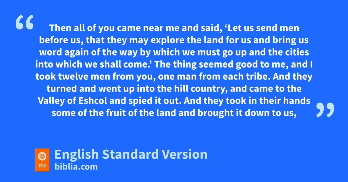 19 “Then we set out from Horeb and ywent through all that great and terrifying wilderness that you saw, on the way to the hill country of the Amorites, as the Lord our God commanded us. And zwe came to Kadesh-barnea. 20 And I said to you, ‘You have come to the hill country of the Amorites, which the Lord our God is giving us. 21 See, the Lord your God has set the land before you. Go up, take possession, as the Lord, the God of your fathers, has told you. aDo not fear or be dismayed.’ 22 Then all of you came near me and said, ‘Let us send men before us, that they may explore the land for us and bring us word again of the way by which we must go up and the cities into which we shall come.’ 23 The thing seemed good to me, and bI took twelve men from you, one man from each tribe. 24 And cthey turned and went up into the hill country, and came to the Valley of Eshcol and spied it out. 25 And they took in their hands some of the fruit of the land and brought it down to us, and brought us word again and said, ‘It is a good land that the Lord our God is giving us.’