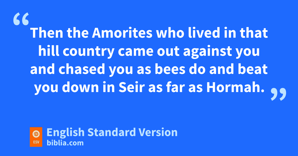 41 “Then you answered me, w‘We have sinned against the Lord. We ourselves will go up and fight, just as the Lord our God commanded us.’ And every one of you fastened on his weapons of war and thought it easy to go up into the hill country. 42 And the Lord said to me, x‘Say to them, Do not go up or fight, yfor I am not in your midst, lest you be defeated before your enemies.’ 43 So I spoke to you, and you would not listen; but you rebelled against the command of the Lord and zpresumptuously went up into the hill country. 44 aThen the Amorites who lived in that hill country came out against you and chased you bas bees do and beat you down in Seir as far as cHormah. 45 And you returned and wept before the Lord, but the Lord did not listen to your voice or give ear to you. 46 So dyou remained at Kadesh many days, the days that you remained there.