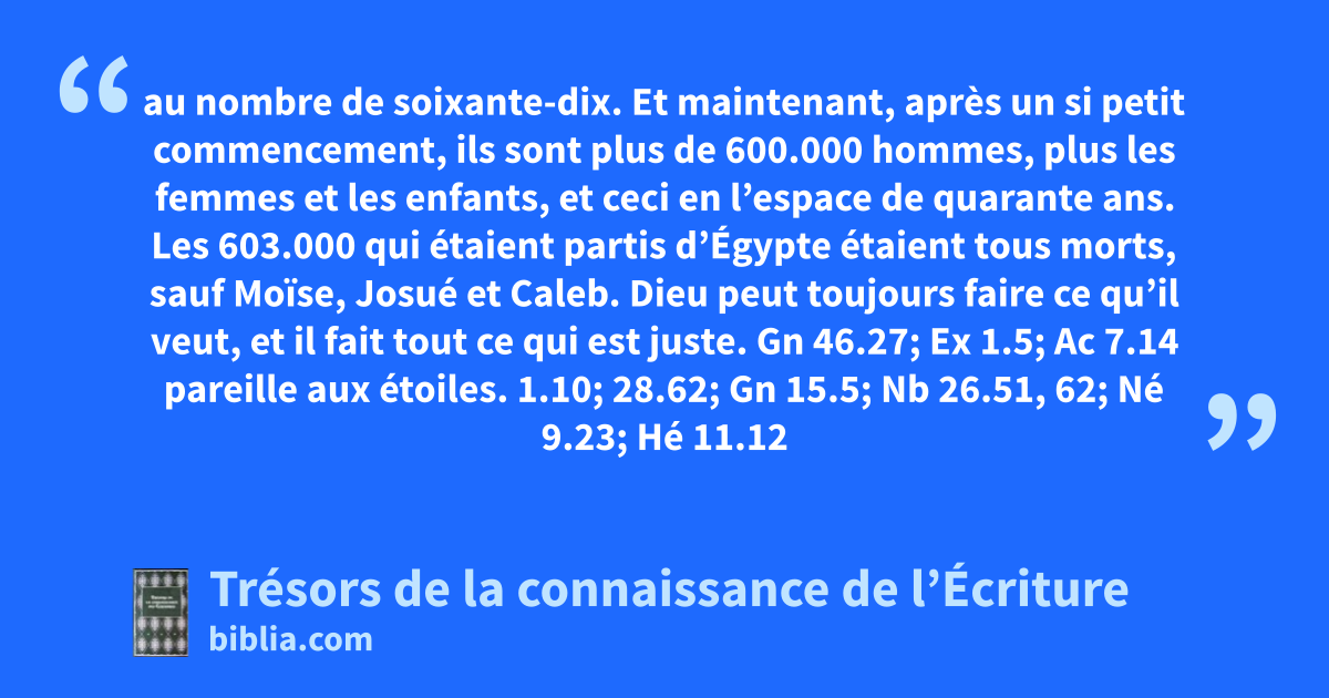 au nombre de soixante-dix. Et maintenant, après un si petit commencement, ils sont plus de 600.000 hommes, plus les femmes et les enfants, et ceci en l’espace de quarante ans. Les 603.000 qui étaient partis d’Égypte étaient tous morts, sauf Moïse, Josué et Caleb. Dieu peut toujours faire ce qu’il veut, et il fait tout ce qui est juste. Gn 46.27; Ex 1.5; Ac 7.14 pareille aux étoiles. 1.10; 28.62; Gn 15.5; Nb 26.51, 62; Né 9.23; Hé 11.12