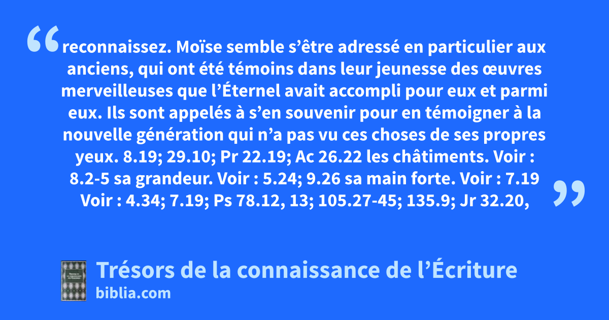reconnaissez. Moïse semble s’être adressé en particulier aux anciens, qui ont été témoins dans leur jeunesse des œuvres merveilleuses que l’Éternel avait accompli pour eux et parmi eux. Ils sont appelés à s’en souvenir pour en témoigner à la nouvelle génération qui n’a pas vu ces choses de ses propres yeux. 8.19; 29.10; Pr 22.19; Ac 26.22 les châtiments. Voir : 8.2-5 sa grandeur. Voir : 5.24; 9.26 sa main forte. Voir : 7.19
