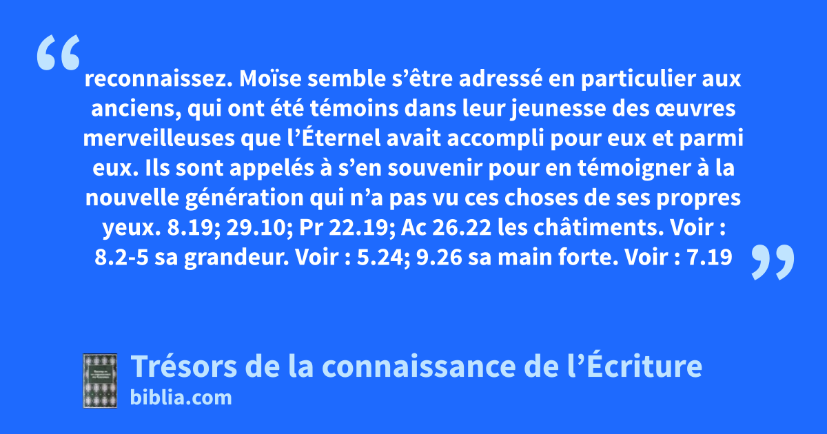 reconnaissez. Moïse semble s’être adressé en particulier aux anciens, qui ont été témoins dans leur jeunesse des œuvres merveilleuses que l’Éternel avait accompli pour eux et parmi eux. Ils sont appelés à s’en souvenir pour en témoigner à la nouvelle génération qui n’a pas vu ces choses de ses propres yeux. 8.19; 29.10; Pr 22.19; Ac 26.22 les châtiments. Voir : 8.2-5 sa grandeur. Voir : 5.24; 9.26 sa main forte. Voir : 7.19