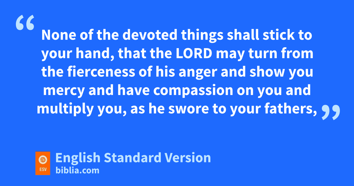 12 “If you hear in one of your cities, which the Lord your God is giving you to dwell there, 13 that certain hworthless fellows have gone out among you and have drawn away the inhabitants of their city, saying, ‘Let us go and serve other gods,’ which you have not known, 14 then you shall inquire and make search and ask idiligently. And behold, if it be true and certain that such an abomination has been done among you, 15 you shall surely put the inhabitants of that city to the sword, devoting it to destruction,3 all who are in it and its cattle, with the edge of the sword. 16 You shall gather all its spoil into the midst of its open square and jburn the city and all its spoil with fire, as a whole burnt offering to the Lord your God. It shall be a kheap forever. It shall not be built again. 17 lNone of the devoted things shall stick to your hand, mthat the Lord may turn from the fierceness of his anger and show you mercy and have compassion on you and multiply you, nas he swore to your fathers, 18 if you obey the voice of the Lord your God, okeeping all his commandments that I am commanding you today, and doing what is right in the sight of the Lord your God.