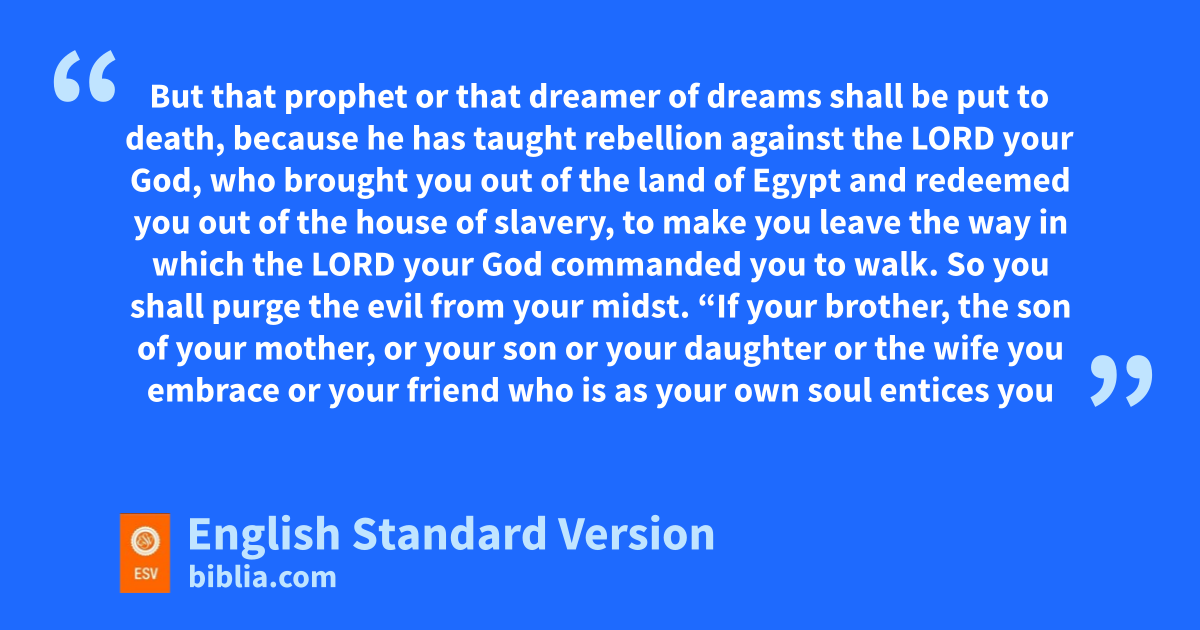 13 “If a prophet or qa dreamer of dreams arises among you and gives you a sign or a wonder, 2 and rthe sign or wonder that he tells you comes to pass, and if he says, ‘Let us go after other gods,’ which you have not known, ‘and let us serve them,’ 3 you shall not listen to the words of that prophet or that dreamer of dreams. For the Lord your God sis testing you, to know whether you love the Lord your God with all your heart and with all your soul. 4 You shall twalk after the Lord your God and fear him and keep his commandments and obey his voice, and you shall serve him and uhold fast to him. 5 But vthat prophet or that dreamer of dreams shall be put to death, because he has taught rebellion against the Lord your God, who brought you out of the land of Egypt and redeemed you out of the house of slavery, to make you leave the way in which the Lord your God commanded you to walk. wSo you shall purge the evil1 from your midst.