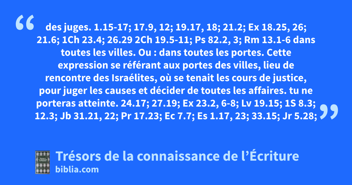 des juges. 1.15-17; 17.9, 12; 19.17, 18; 21.2; Ex 18.25, 26; 21.6; 1Ch 23.4; 26.29 2Ch 19.5-11; Ps 82.2, 3; Rm 13.1-6 dans toutes les villes. Ou : dans toutes les portes. Cette expression se référant aux portes des villes, lieu de rencontre des Israélites, où se tenait les cours de justice, pour juger les causes et décider de toutes les affaires.