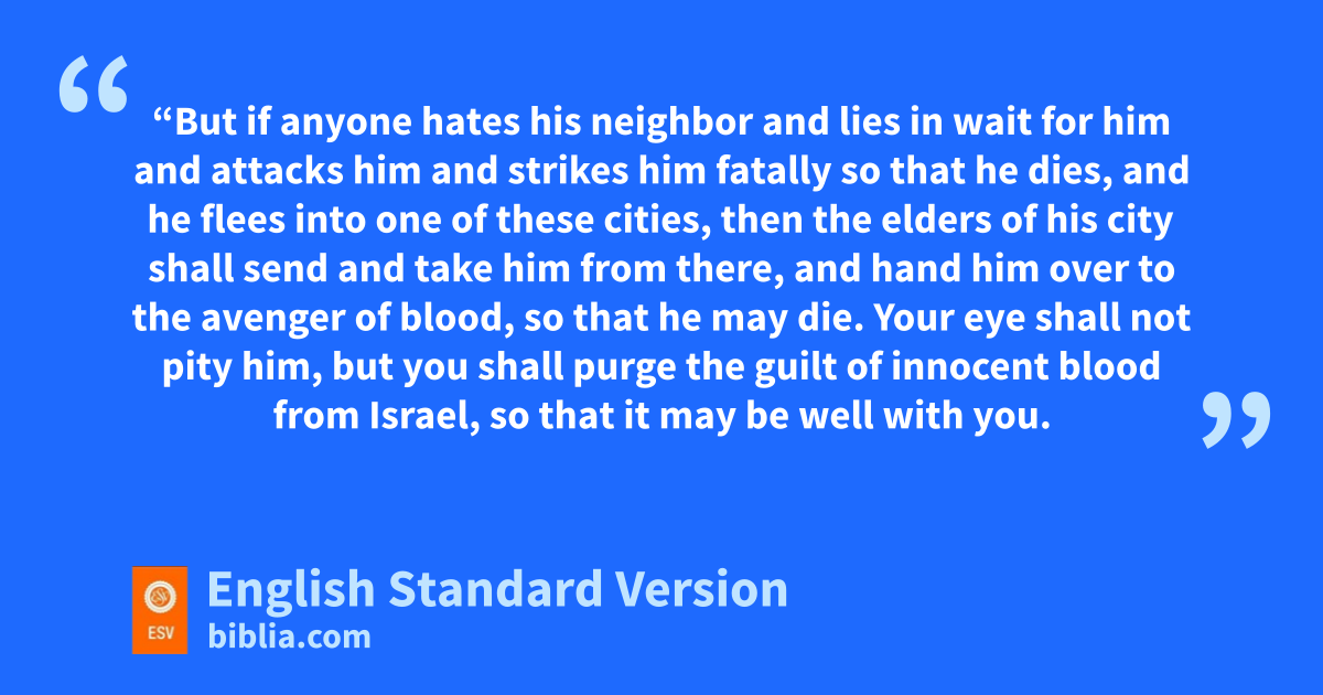11 “But if anyone hates his neighbor and lies in wait for him and attacks him xand strikes him fatally so that he dies, and he flees into one of these cities, 12 then the elders of his city shall send and take him from there, and hand him over to the avenger of blood, so that he may die. 13 yYour eye shall not pity him, zbut you shall purge the guilt of innocent blood2 from Israel, so that it may be well with you.