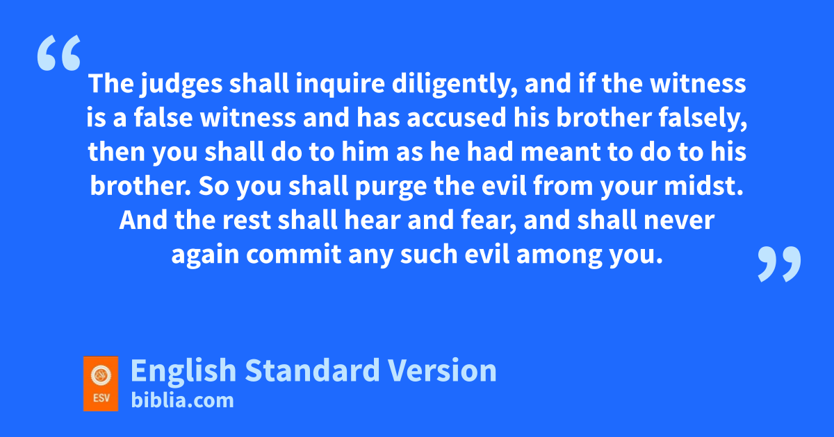 15 “A single witness shall not suffice against a person for any crime or for any wrong in connection with any offense that he has committed. bOnly on the evidence of two witnesses or of three witnesses shall a charge be established. 16 If ca malicious witness arises to accuse a person of wrongdoing, 17 then both parties to the dispute shall appear before the Lord, dbefore the priests and the judges who are in office in those days. 18 The judges shall einquire diligently, and if the witness is a false witness and has accused his brother falsely, 19 fthen you shall do to him as he had meant to do to his brother. So you shall purge the evil3 from your midst. 20 And the rest gshall hear and fear, and shall never again commit any such evil among you. 21 yYour eye shall not pity. hIt shall be life for life, eye for eye, tooth for tooth, hand for hand, foot for foot.