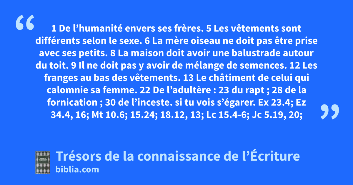 1 De l’humanité envers ses frères. 5 Les vêtements sont différents selon le sexe. 6 La mère oiseau ne doit pas être prise avec ses petits. 8 La maison doit avoir une balustrade autour du toit. 9 Il ne doit pas y avoir de mélange de semences. 12 Les franges au bas des vêtements. 13 Le châtiment de celui qui calomnie sa femme. 22 De l’adultère : 23 du rapt ; 28 de la fornication ; 30 de l’inceste.