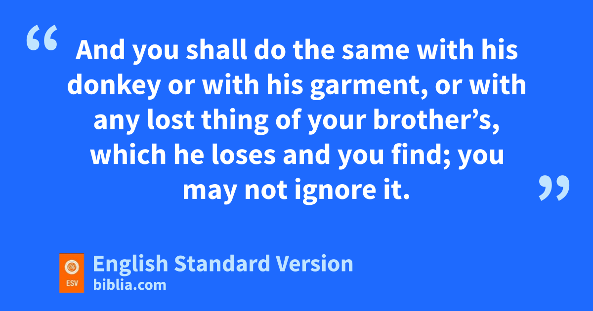 22 “You sshall not see your brother’s ox or his sheep going astray and ignore them. You shall take them back to your brother. 2 And if he does not live near you and you do not know who he is, you shall bring it home to your house, and it shall stay with you until your brother seeks it. Then you shall restore it to him. 3 And you shall do the same with his donkey or with his garment, or with any lost thing of your brother’s, which he loses and you find; you may not ignore it. 4 tYou shall not see your brother’s donkey or his ox fallen down by the way and ignore them. You shall help him to lift them up again.