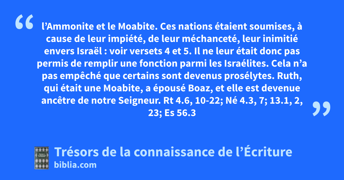 l’Ammonite et le Moabite. Ces nations étaient soumises, à cause de leur impiété, de leur méchanceté, leur inimitié envers Israël : voir versets 4 et 5. Il ne leur était donc pas permis de remplir une fonction parmi les Israélites. Cela n’a pas empêché que certains sont devenus prosélytes. Ruth, qui était une Moabite, a épousé Boaz, et elle est devenue ancêtre de notre Seigneur. Rt 4.6, 10-22; Né 4.3, 7; 13.1, 2, 23; Es 56.3