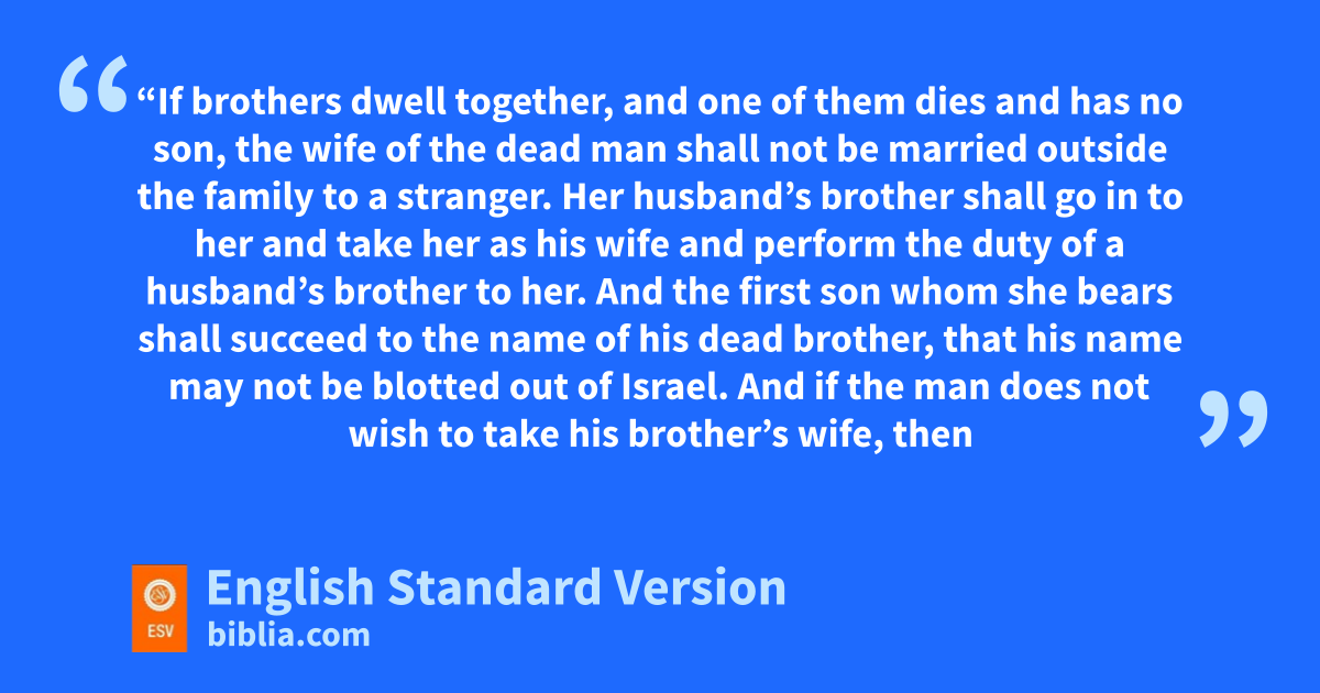 5 e“If brothers dwell together, and one of them dies and has no son, the wife of the dead man shall not be married outside the family to a stranger. Her fhusband’s brother shall go in to her and take her as his wife and perform the duty of a husband’s brother to her. 6 And the first son whom she bears shall succeed to the name of his dead brother, that ghis name may not be blotted out of Israel. 7 And if the man does not wish to take his brother’s wife, then his brother’s wife shall hgo up to the gate to the elders and say, ‘My husband’s brother refuses to perpetuate his brother’s name in Israel; he will not perform the duty of a husband’s brother to me.’ 8 Then the elders of his city shall call him and speak to him, and if he persists, saying, i‘I do not wish to take her,’ 9 then his brother’s wife shall go up to him in the presence of the elders and jpull his sandal off his foot and kspit in his face. And she shall answer and say, ‘So shall it be done to the man who does not lbuild up his brother’s house.’ 10 And the name of his house1 shall be called in Israel, ‘The house of him who had his sandal pulled off.’